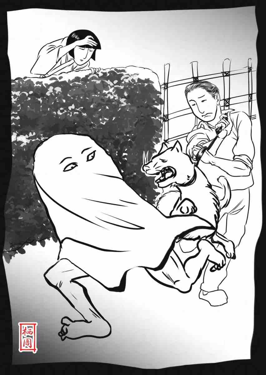 散歩中の犬が回転しながら吠え、飼い主も「うわぁうわぁ」と咆哮し、混乱した変質者は毛布オバケと化し走り出した。
